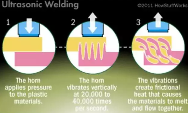 超声波作用于热塑性的塑料接触面时,会产生每秒几万次的高频振动,这种达到一定振幅的高频振动,通过上焊件把超声能量传送到焊区,由于焊区即两个焊接的交界面处声阻大,因此会产生局部高温。又由于塑料导热性差,一时还不能及时散发,聚集在焊区,致使两个塑料的接触面迅速熔化,加上一定压力后,使其融合成一体。当超声波停止作用后,让压力持续几秒钟,使其凝固成型,这样就形成一个坚固的分子链,达到焊接的目的,焊接强度能接近于原材料强度。